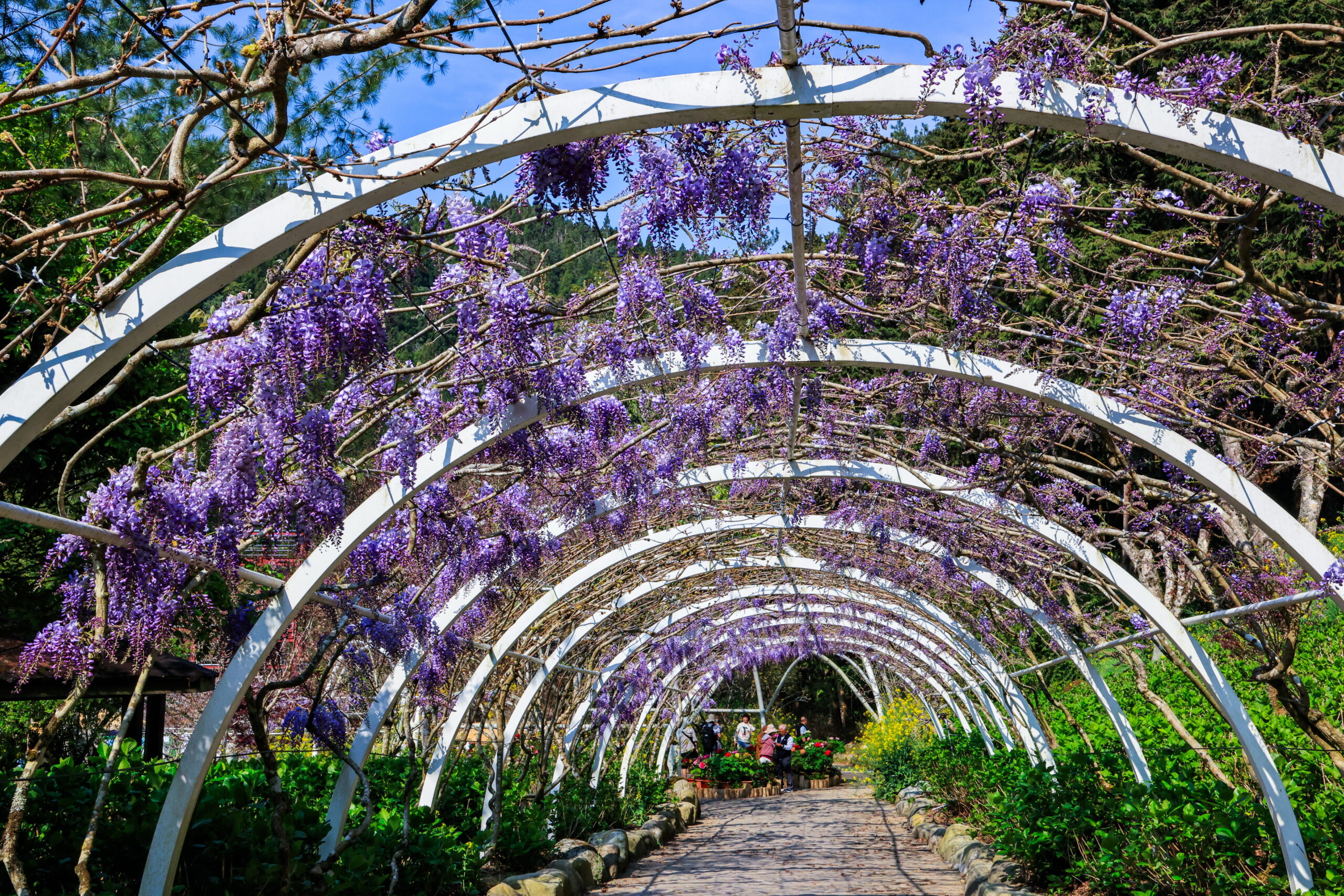 園區特別改造種植的紫藤隧道模式花廊全長約200公尺,深邃的視覺效果極具高度的觀賞性。圖/杉林溪提供