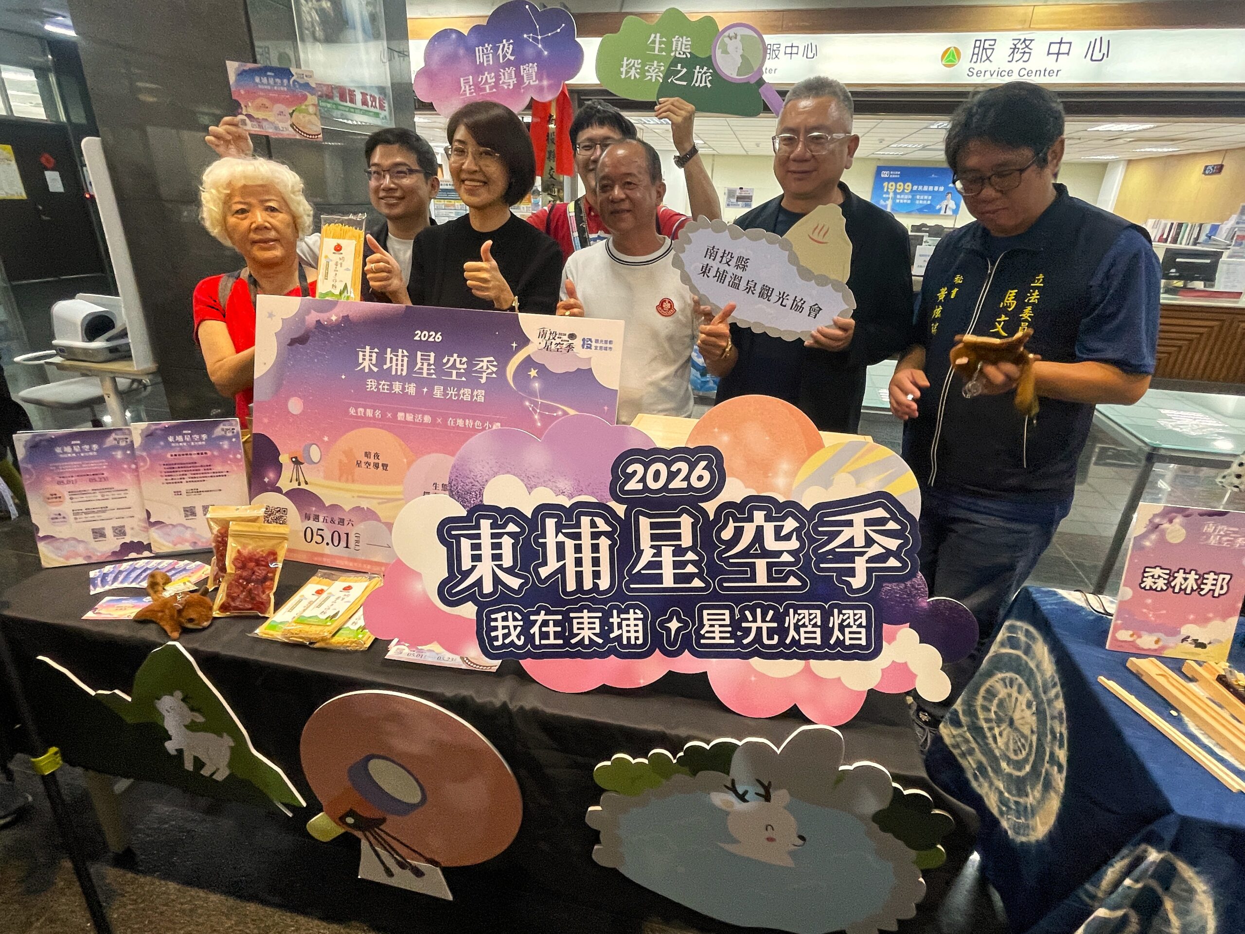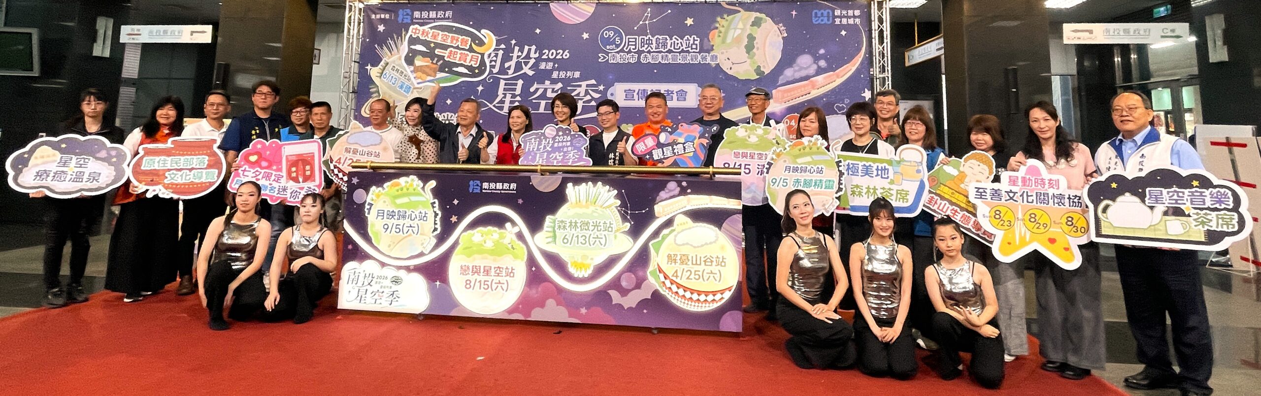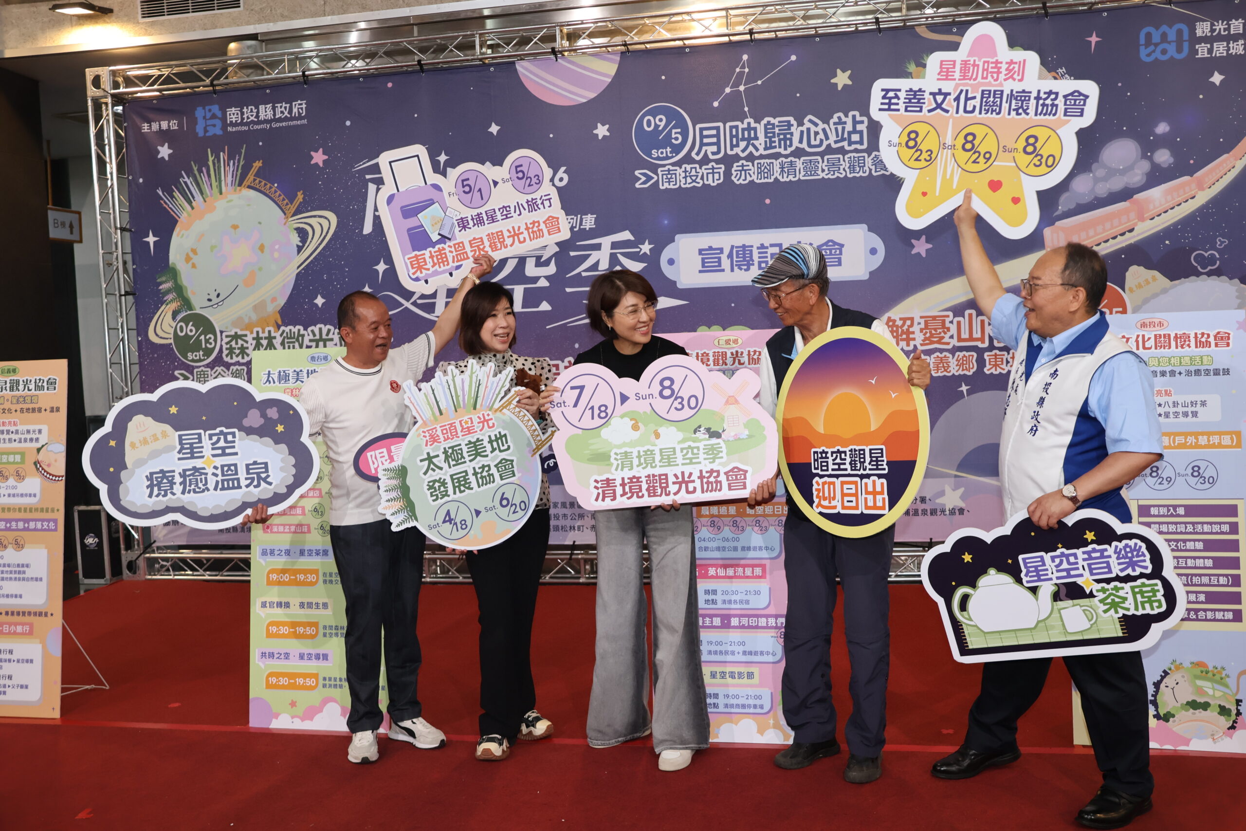 許縣長與縣內各觀光旅遊發展協會代表多人一起啟動星投列車,象徵星空季活動正式展開。同時邀請承辦4場次活動的東埔溫泉觀光協會、太極美地發展協會、清境觀光協會及至善文化關懷協會等代表上台展示活動內容。