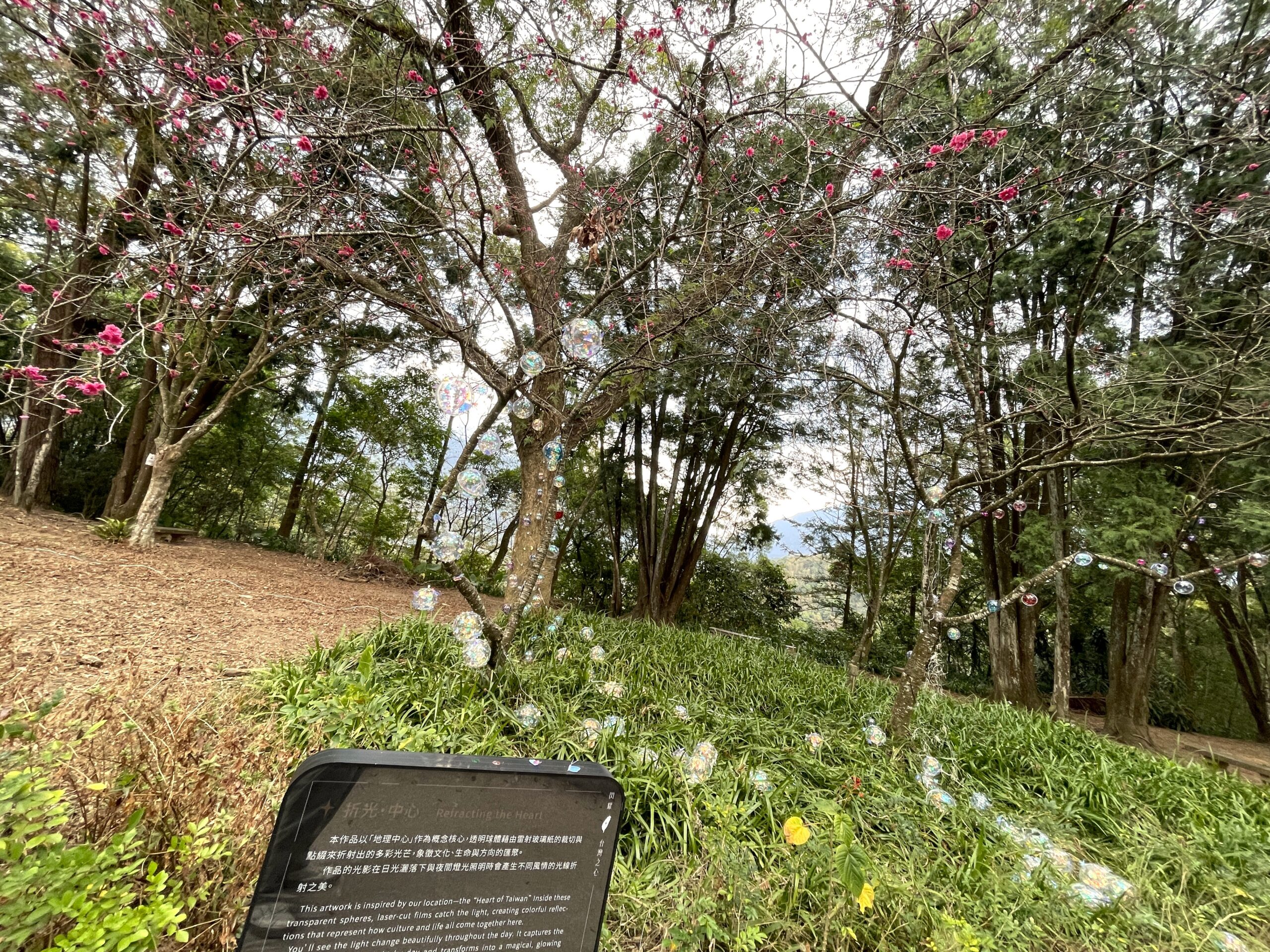 本屆逐燈祭有四個由埔里在地藝術家帶領社區及孩子共同創作燈區。李翌綸老師的〈折光・中心〉,透過透明球體與光線折射,呈現白天與夜晚截然不同的光影樣貌。