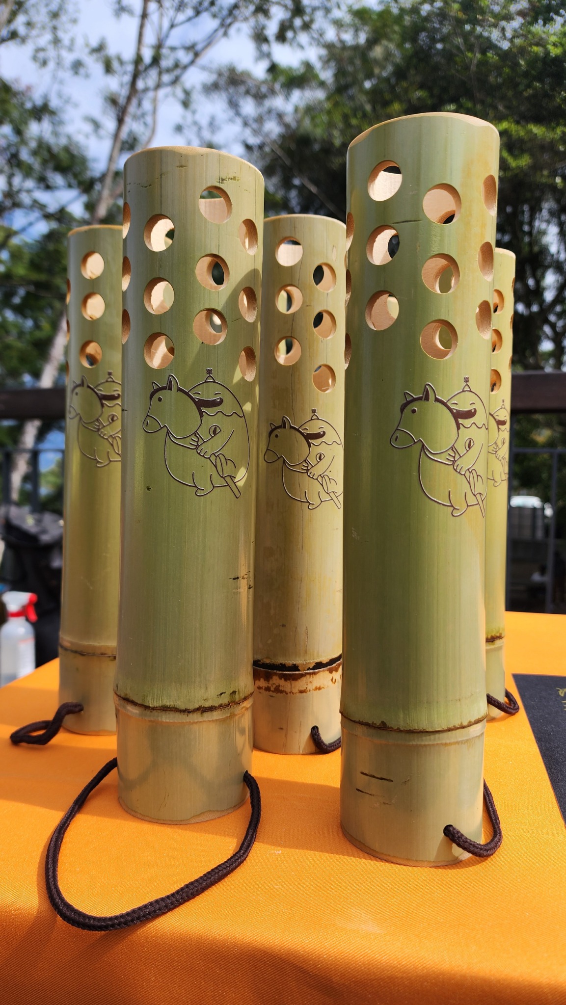 今年提燈延續竹材特色,上面有埔里吉祥物「噗哩」騎木馬圖樣,象徵馬到成功,開幕當天將發放限量。圖/埔里鎮公所提供