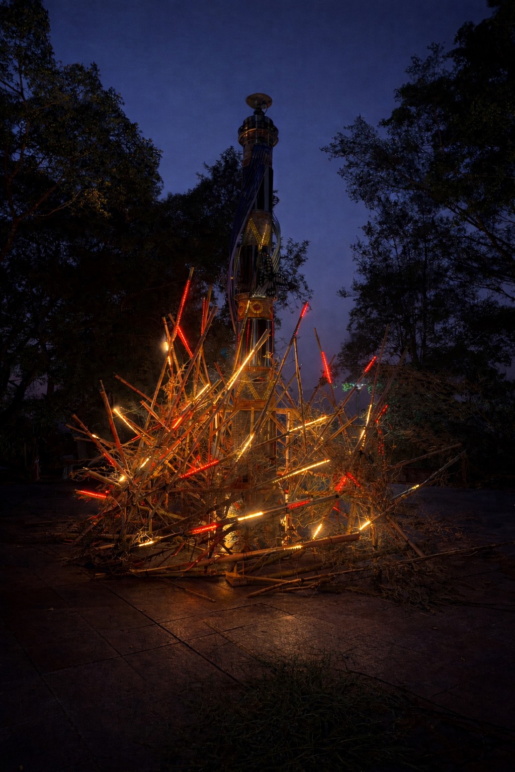 馬年主燈〈眾心之聚〉設於中心碑 以竹構結合紅色光影環繞「台灣之心」象徵凝聚鎮民熱情力量